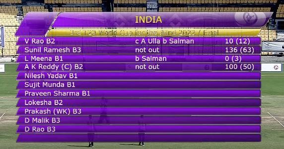 भारत की ओर से इस मैच में दो शतक आए, जिसमें सुनील रमेश ने 63 बॉल में 136 रनों की पारी खेली. जबकि कप्तान अजय रेड्डी ने 50 बॉल में 100 रन बना डाले, टीम इंडिया ने 20 ओवर में 2 विकेट खोकर 277 रन बनाए थे. जवाब में बांग्लादेश की टीम 20 ओवर में 157 रन बना पाई, उसने 3 विकेट खोए थे.