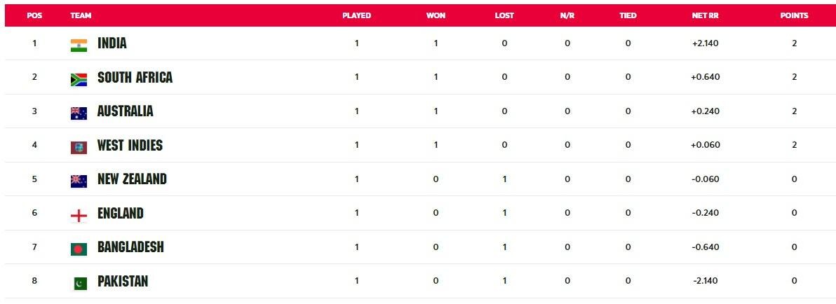 पाकिस्तान के खिलाफ मिली इस शानदार जीत के बाद टीम इंडिया वर्ल्डकप की प्वाइंट टेबल के टॉप पर पहुंच गई है. भारत ने एक मैच खेला है और उसके 2 प्वाइंट हैं, जबकि नेट रनरेट 2.14 का है. वहीं पाकिस्तान की टीम प्वाइंट टेबल में सबसे नीचे पहुंच गई है.