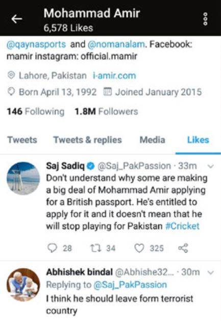 इसके बाद एक फैन ने लिखा, 'मेरा मानना है कि मोहम्मद आमिर को आतंकी देश छोड़ देना चाहिए.' मोहम्मद आमिर ने इस ट्वीट को लाइक कर दिया. जिसके बाद यह विवाद पैदा हो गया.