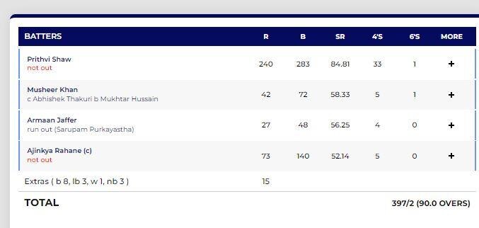 असम के खिलाफ पहले दिन पृथ्वी शॉ 240 रन बनाकर नाबाद हैं, उन्होंने सिर्फ 283 बॉल में यह स्कोर बनाया है. इस दौरान पृथ्वी शॉ ने 33 चौके और 1 छक्का जड़ा है, पृथ्वी की इस पारी की बदौलत ही मुंबई पहले दिन 397 रन बना चुकी है. पृथ्वी शॉ के अलावा कप्तान अजिंक्य रहाणे भी 73 रन बनाकर नाबाद हैं.