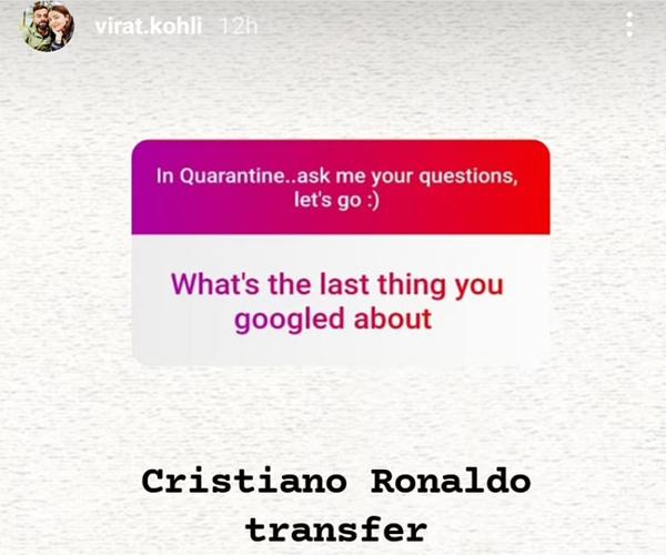 विराट कोहली ने इंस्टाग्राम पर लिखा, ‘मैं क्वारनटीन में हूं, मुझसे सवाल पूछें’. इस दौरान एक फैन ने कोहली से सवाल किया कि आपने गूगल पर आखिरी बार क्या सर्च किया था. इस सवाल का जवाब देते हुए विराट कोहली ने दिग्गज फुटबॉलर क्रिस्टियानो रोनाल्डो का नाम लिया.
