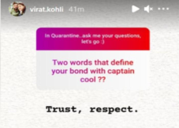 कोहली ने अपने इंस्टाग्राम अकाउंट पर सवाल-जवाब का सेशन रखा. इस दौरान फैन्स ने कोहली से कई सवाल किए. एक फैन ने कोहली से महेंद्र सिंह धोनी के साथ उनकी बॉन्डिंग के बारे में सिर्फ दो शब्दों में बताने के लिए कहा. इस पर विराट ने लिखा, ' विश्वास और सम्मान.'