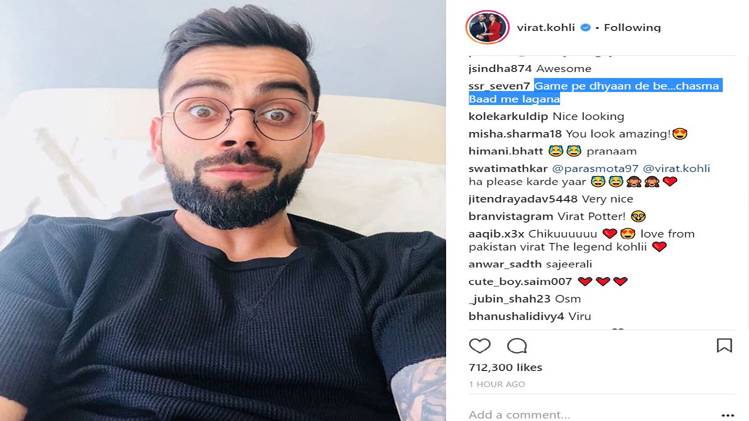हाल ही में विराट कोहली ने अपने सोशल मीडिया अकाउंट पर एक तस्वीर शेयर की है, जिसमें वह नए चश्मे में नजर आ रहे हैं. अपनी इस तस्वीर के कैप्शन में कप्तान विराट कोहली ने लिखा कि 'इस चश्मे से बहुत प्यार है.'