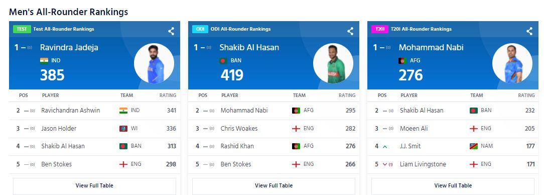 रवींद्र जडेजा इस वक्त दुनिया के नंबर-1 टेस्ट ऑलराउंडर हैं, उनके 385 प्वाइंट हैं. उनके बाद रविचंद्रन अश्विन का नंबर है, जिनके 341 प्वाइंट हैं. आईपीएल में खेल रहे जेसन होल्डर तीसरे नंबर पर हैं, जिनके 336 प्वाइंट हैं.