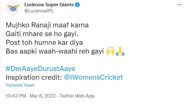 सिर्फ इस अकाउंट ही नहीं बल्कि अन्य यूजर्स ने भी लखनऊ सुपर जायंट्स को खरी-खोटी सुनाई. जिसके बाद पहले लखनऊ सुपर जायंट्स ने तस्वीर के लिए क्रेडिट दिया और बाद में माफी भी मांगी. लखनऊ सुपर जायंट्स ने लिखा कि मुझको राणाजी माफ करना, गलती म्हारे से हो गई. पोस्ट तो हमने कर दिया, बस आपकी वाह-वाही रह गई. लखनऊ ने यहां पर प्रेरककर्ता Women In Blue- Memories अकाउंट को बताया.