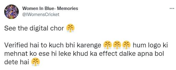 लखनऊ सुपर जायंट्स ने जब तस्वीर को बिना किसी क्रेडिट के शेयर किया, तब फैन्स ने इसपर घोर आपत्ति जताई. साथ ही तस्वीर बनाने वाले अकाउंट Women In Blue- Memories ने भी इसपर आपत्ति जताई और लिखा कि डिजिटल चोर को देखिए, वेरिफाइड अकाउंट है तो कुछ भी करेंगे. हम लोगों की मेहनत को ऐसे ही लेकर खुद का इफेक्ट डालकर अपना बोल देते हैं.