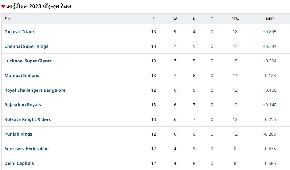 वहीं चेन्नई सुपर किंग्स (CSK), लखनऊ सुपर जायंट्स (LSG), मुंबई इंडियंस (Mumbai Indians), रॉयल चैलेंजर्स बेंगलुरू (RCB), पंजाब किंग्स (PBKS), राजस्थान रॉयलस (RR) के लिए अब समीकरण क्या रहेंगे? वो आपको बता देते हैं. दिल्ली (DC) और सनराइजर्स हैदराबाद (SRH) की टीम प्लेऑफ की रेस से बाहर हो गई है. वहीं हार्दिक पंड्या की गुजरात टाइटन्स (GT) प्लेऑफ में जगह सुरक्षित करने वाली पहली टीम बन गई है.