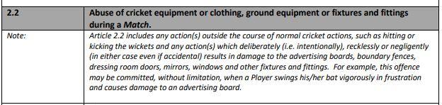 आर्टिकल 2.2 मैच के दौरान क्रिकेट उपकरण या कपड़े, ग्राउंड उपकरण या फिटिंग का दुरुपयोग के बारे में है. इससे पहले इसी आर्टिकल के तहत लखनऊ सुपरजायन्ट्स के आवेश खान पर भी एक्शन हुआ था. तब उन्होंने RCB के खिलाफ विजयी रन लेने के बाद अपना हेलमेट जमीन पर फेंक दिया था.