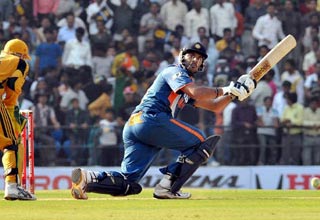 नागपुर में खेले गए दूसरे वनडे में भारत ने ऑस्ट्रेलिया को 99 रनों से पराजित कर दिया. ऑस्ट्रेलियाई गेंदबाज का शिकार बने भारतीय बल्लेबाज युवराज सिंह.