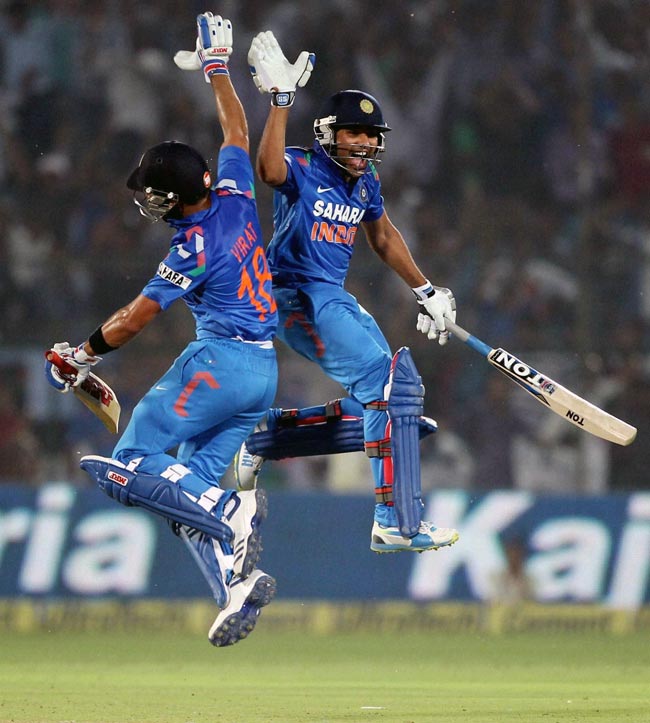 धवन के आउट होने के बाद विराट कोहली बल्लेबाजी करने मैदान में आए और आते ही उन्होंने ताबड़तोड़ चौके छक्के लगाए.