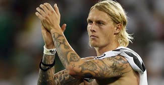 डेनमार्क और जर्मनी के मुकाबले से पहले एक दूसरे को किस करता हुए एक जोड़ा.
