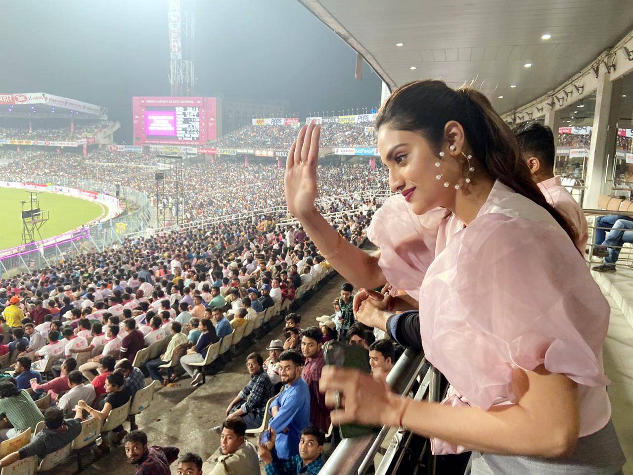 ईडन गार्डन्स स्टेडियम में नुसरत जहां के साथ उनके पति निखिल जैन भी मैच देखने आए.