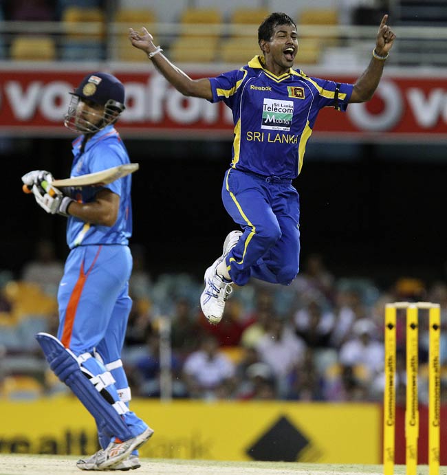 सचिन तेंदुलकर का विकेट लेने के बाद खुशी मनाते श्रीलंकाई गेंदबाज नुआन कुलशेखरा.