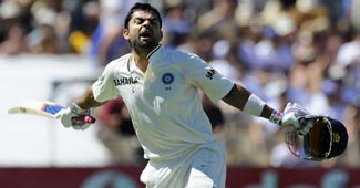 चौथे दिन के खेल के आखिरी क्षणों में विराट कोहली को रन आउट करने के बाद जश्न मनाते हुए ऑस्ट्रेलियाई खिलाड़ी.