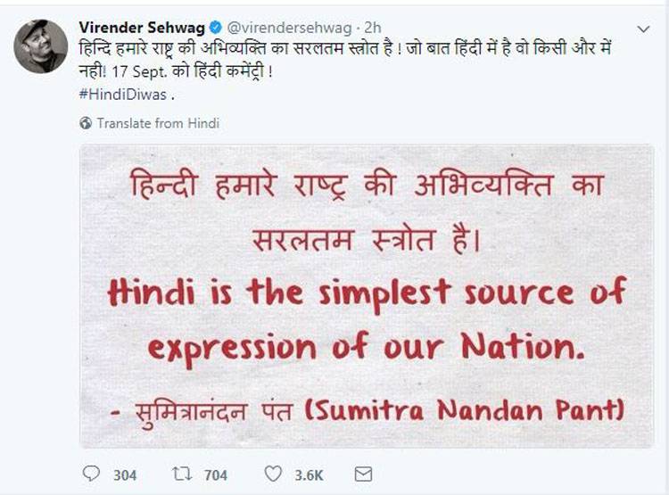 सहवाग ने ट्वीट किया- 'हिन्दि हमारे राष्ट्र की अभिव्यक्ति का सरलतम स्त्रोत है ! जो बात हिंदी में है वो किसी और में नही! 17 Sept. को हिंदी कमेंट्री ! #HindiDiwas .'