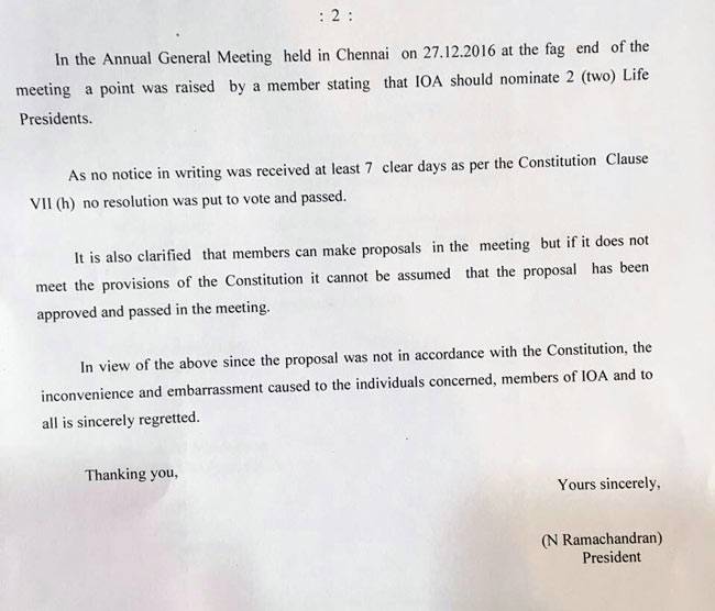 आईओए के अध्यक्ष एन.रामचंद्रन ने कहा कि अभय चौटाला और सुरेश कलमाड़ी को आजीवन अध्यक्ष के रूप में ना चुने जाने का फैसला चेन्नई के सालाना आम बैठक में लिया गया है.