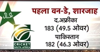 दक्षिण अफ्रीका ने 5 मैचों की वन-डे सीरीज के पहले मैच में पाकिस्तान को एक रन से हरा दिया. शारजाह में खेले गए मुकाबले में दक्षिण अफ्रीकी टीम 183 रन पर सिमट गई थी, लेकिन जवाब में पाकिस्तान भी 182 रन पर सिमट गया. पाकिस्तान ने अपने आखिरी 6 विकेट महज 39 गेंदों पर खो दिए और वह इन गेंदों पर महज 17 रन ही बना सका.