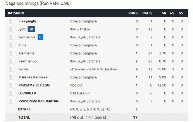 इंदौर के होल्कर स्टेडियम में नगालैंड ने टॉस जीतकर पहले बल्लेबाजी करने का फैसला किया. नगालैंड की महिलाएं एक-एक कर आउट होकर पवेलियन लौटती गईं. कोई भी बल्लेबाज दोहरे अंकों में नहीं पहुंच पाईं. नागालैंड की पूरी टीम 17.4 ओवरों में 17 रनों पर सिमट गई.