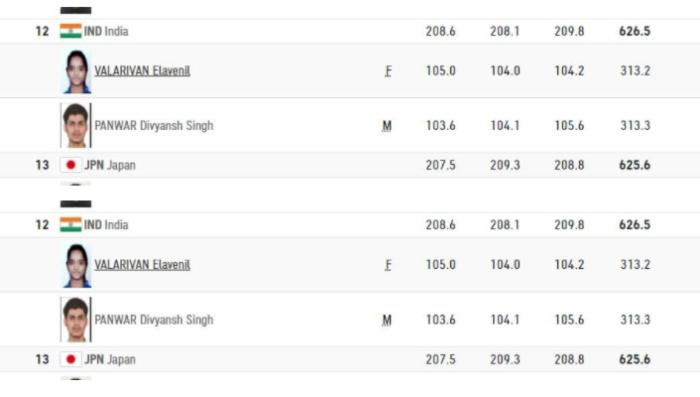 इलावेनिल वालारिवन और दिव्यांश सिंह पंवार, अंजुम मोदगिल और दीपक कुमार की जोड़ी ने अच्छी शुरुआत नहीं की है. इलावेनिल वालारिवन और दिव्यांश सिंह पंवार की जोड़ी टॉप 15 में है लेकिन अंजुम मोदगिल और दीपक कुमार की जोड़ी अपना पूरा समय ले रही है. वालारिवन ने पहली सीरीज में 105, दूसरी में 104 और तीसरी में 104.2 अंक हासिल किए. दिव्यांश सिंह पंवार ने पहली सीरीज में 103.6 और दूसरी सीरीज में 104.1 अंक लिए.