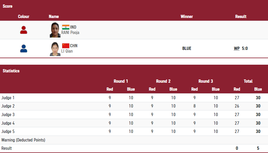 पूजा रानी के पास मेडल पक्का करने का मौका था, लेकिन वह चूक गईं. चीन की ली कियान पूरे मैच में पूजा रानी पर हावी नजर आईं. उन्होंने पूजा को वापसी करने का मौका नहीं दिया.