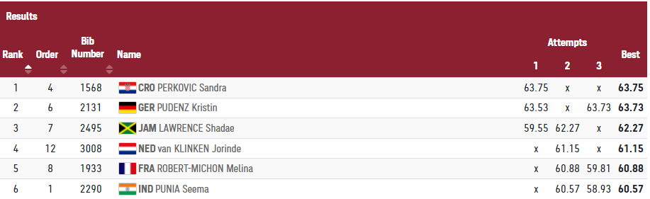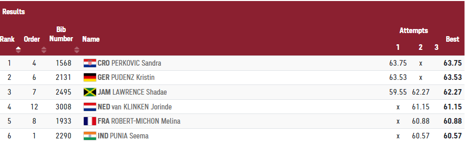 सीमा पूनिया ने दूसरे प्रयास में अच्छा थ्रो किया है. उन्होंने 60.57 मीटर का थ्रो किया. सीमा अब फॉर्म में आ रही हैं. वह तीसरे स्थान पर पहुंच गई हैं. पहले नंबर पर क्रोएशिया की सांद्रा परकोविक हैं. उनका थ्रो 63.75 मीटर का था.