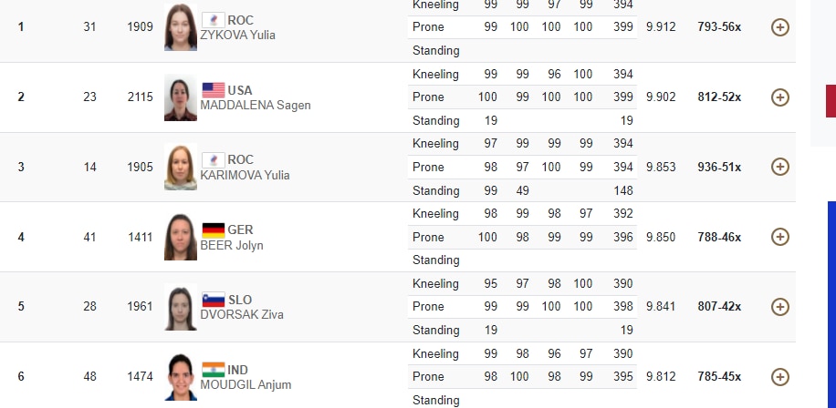 क्वालिफिकेशन के आखिरी राउंड स्टैंडिंग में अंजुम ने 94, 95, 96, 97 के स्कोर से 382 अंक बटोरे, जबकि उन्होंने Kneeling में 390 और Prone में 395 अंक बनाए थे. तेजस्वी ने स्टैंडिंग में 94, 93, 95, 94 के स्कोर से 376 का स्कोर बनाया, जबकि उन्होंने Kneeling में 384 और Prone में 394 अंक बटोरे थे.