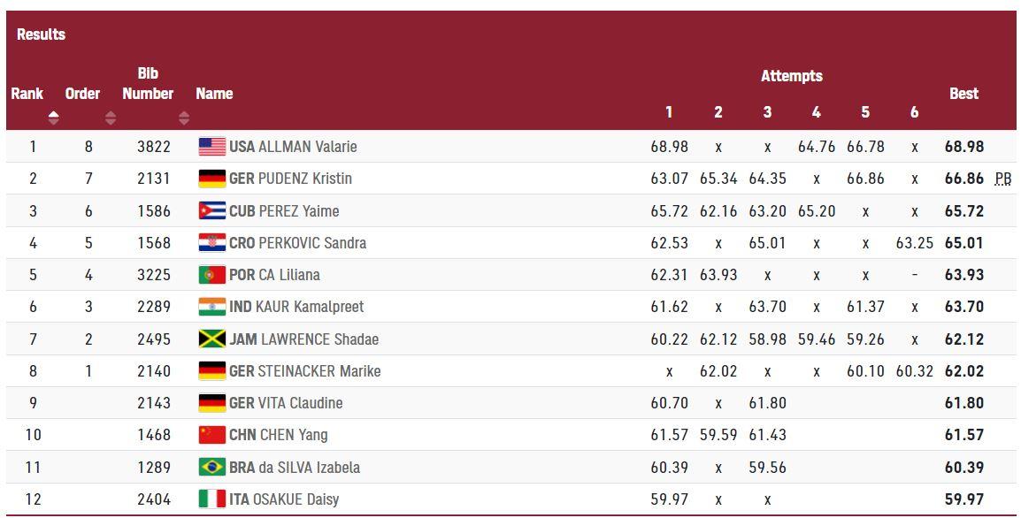 पंजाब के काबरवाला गांव के एक किसान की बेटी कमलप्रीत ने शनिवार को 64 मीटर का थ्रो लगाकर पदक की उम्मीद जगाई थीं. अमेरिका की वालारी आलमैन 68.98 मीटर के थ्रो के साथ स्वर्ण, जर्मनी की क्रिस्टीन पुडेंज को रजत और मौजूदा विश्व चैम्पियन क्यूबा की येमे पेरेज को कांस्य पदक मिला. दो बार की गत चैम्पियन क्रोएशिया की सैंड्रा पेरकोविच चौथे स्थान पर रहीं.