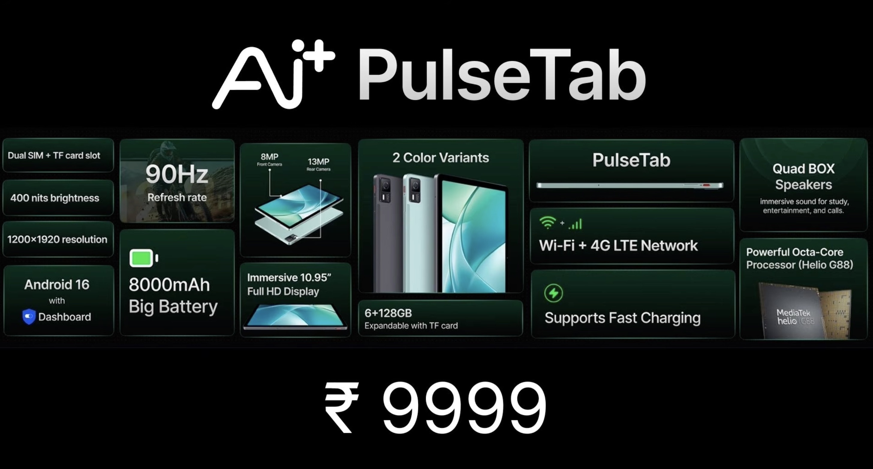 सिर्फ स्मार्टफोन ही नहीं, कंपनी ने PulseTab नाम से अपना पहला टैबलेट भी लॉन्च किया है. इसमें 10.95 इंच की डिस्प्ले, 90Hz रिफ्रेश रेट और 8000mAh बैटरी दी गई है. इसकी कीमत 9,999 रुपये रखी गई है, जो इसे बजट टैबलेट सेगमेंट में मजबूत बनाती है.