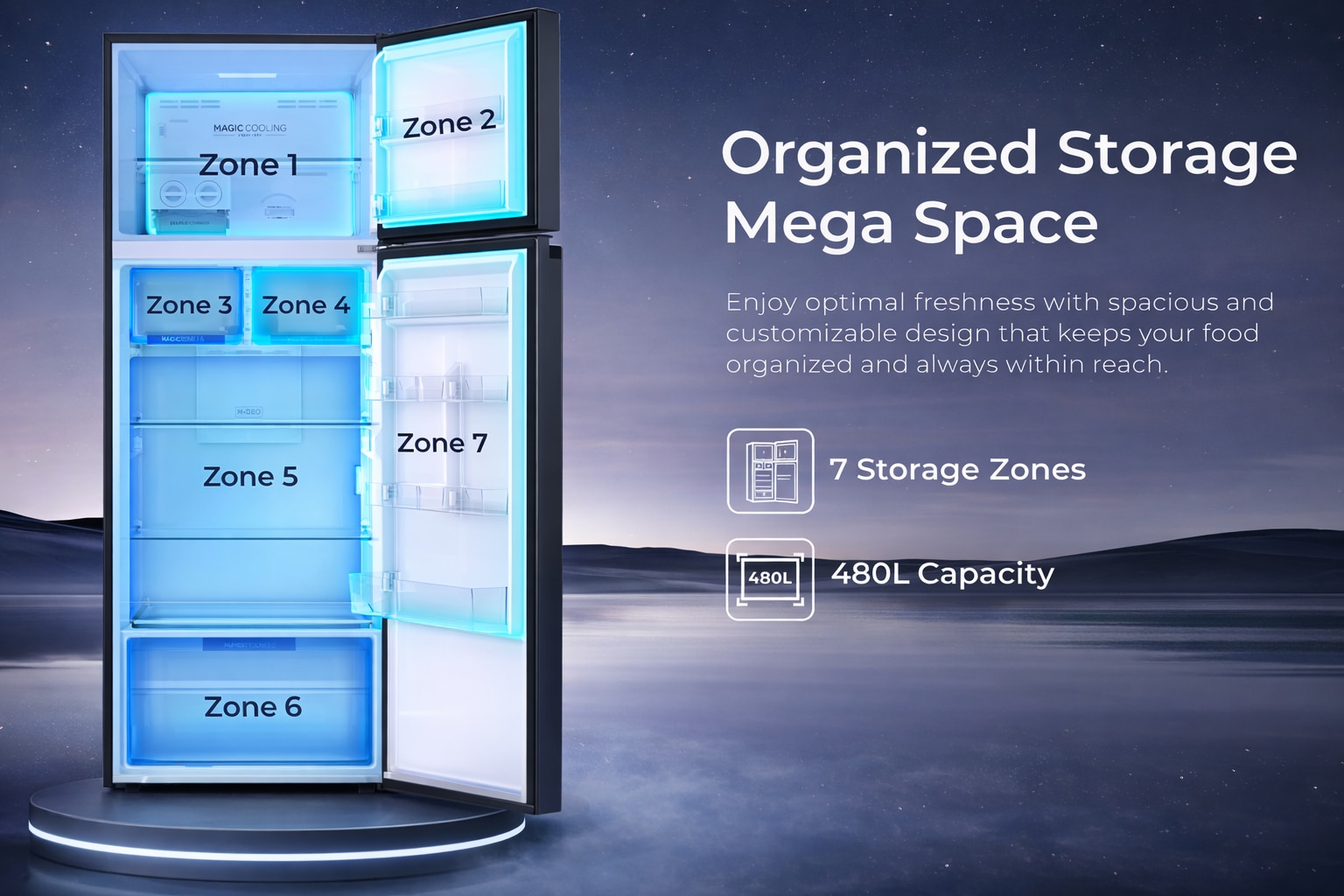 अब अंदर चलते हैं, क्योंकि असली खेल वहीं है. 475 लीटर का मतलब ये है कि अगर आपका परिवार बड़ा है या आप बार-बार सब्जी लेने नहीं जाना चाहते, तो ये फ्रिज बहुत राहत देता है.