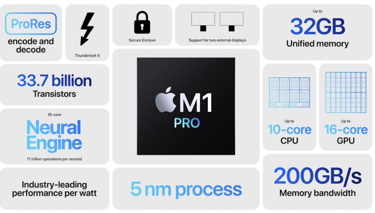 ऐपल ने कहा है कि M1 चिपसेट के मुकाबले नया M1 Pro चिप 70% फास्ट है. आपको बता दें कि कंपनी ने अपने लैपटॉप में इंटेल के बजाए खुद का बनाया हुआ प्रोसेसर देने लगी है.