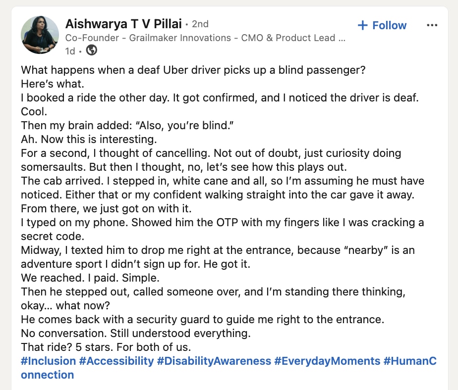 महिला ने राइड बुक की और उन्हें पता चला कि ड्राइवर सुन नहीं सकता. उसी वक्त उन्हें यह भी एहसास हुआ कि वह खुद देख नहीं सकतीं. यानी एक तरफ ड्राइवर डेफ (Deaf) था और दूसरी तरफ पैसेंजर ब्लाइंड (Blind).