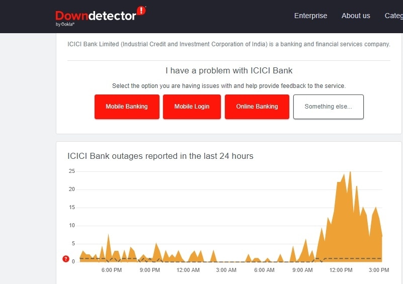 इसके अलावा दुनियाभर के पोर्टल के आउटेज को ट्रैक करने वाली वेबसाइट DownDetector ने भी इस आउटेज की जानकारी दी. ICICI Bank पर प्रोब्लम को लेकर बहुत से लोगों ने रिपोर्ट की. इसकी शुरुआत सुबह 8 बजे से हो गई थी, इसके बाद 10 बजे से इस पर बहुत से लोगों ने रिपोर्ट किया और ये ग्राफ तेजी से ऊपर बढ़ा, जैसा कि आप ऊपर दिए गए ग्राफ में देख सकते हैं.