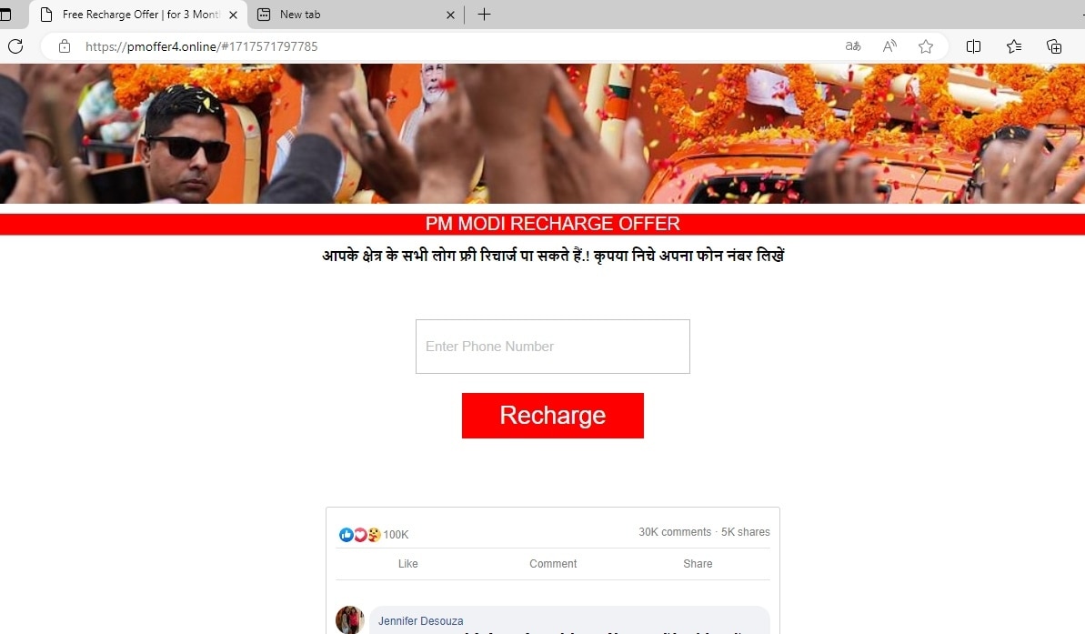 भारत में लोकसभा चुनाव के वोटों की गिनती हो चुकी है और इस दौरान प्रधानमंत्री नरेंद्र मोदी के नेतृत्व में NDA को पूर्ण बहुमत मिला है. अब हमें WhatsApp पर एक ऐसा मैसेज मिला है, जिसमें PM मोदी का नाम का इस्तेमाल करके फ्री रिचार्ज देने का वादा किया जा रहा है. इसके साथ एक लिंक भी शेयर किया है.