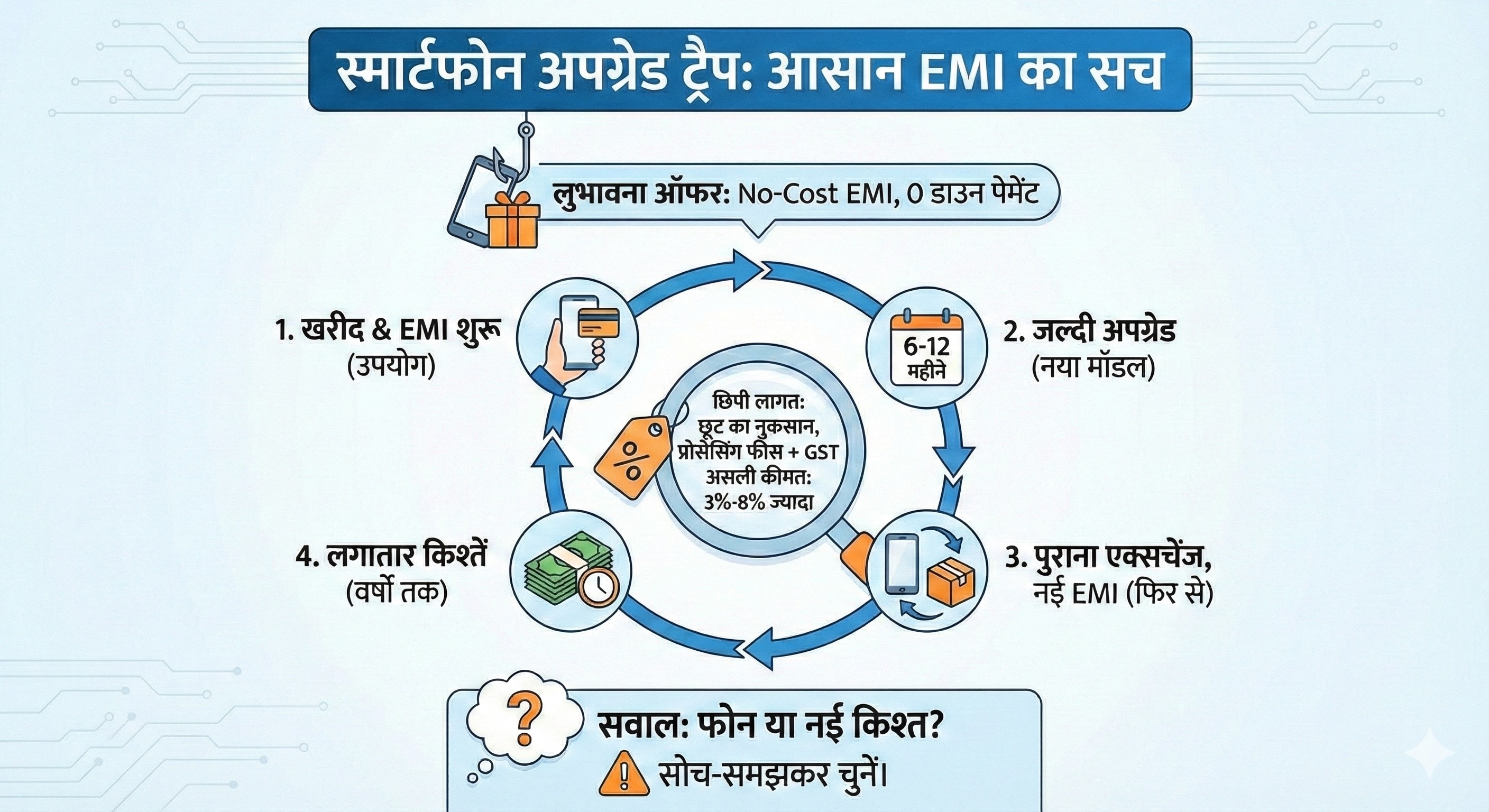 आज हम फोन खरीद रहे हैं. या हर साल नई EMI खरीद रहे हैं? इस सवाल का जवाब सिर्फ पैमेंट विकल्प में नहीं है. यह आपके खर्च, आदत और खरीदने की सोच में छुपा है. Upgrade Trap के बड़ी सच्चाई है.
