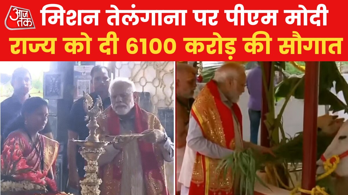 प्रधानमंत्री नरेंद्र मोदी शनिवार को तेलंगाना दौरे पर पहुंचे हैं. पीएम ने सबसे पहले प्रसिद्ध भद्रकाली मंदिर में पूजा-अर्चना की. उसके बाद आश्रम में गायो को चारा खिलाया. पीएम ने करीब 6,100 करोड़ रुपये की कई विकास परियोजनाओं का लोकार्पण और आधारशिला रखी है. उसके बाद कार्यक्रम को भी संबोधित किया.