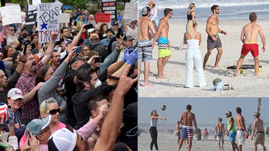 दुनिया में कोरोना वायरस से सोमवार दोपहर तक एक लाख 65 हजार लोगों की मौतें हो चुकी हैं. इनमें से 40,661 मौत सिर्फ अमेरिका में हुई है. बावजूद इसके अमेरिका में बड़े पैमाने पर लॉकडाउन का विरोध हो रहा है. लोग सड़कों पर उतरकर प्रदर्शन कर रहे हैं. वहीं, फ्लोरिडा में लोगों को बीच पर भी जाने की इजाजत दे दी गई. लोगों ने बीच पर सोशल डिस्टेंसिंग के नियमों का भी पालन नहीं किया.