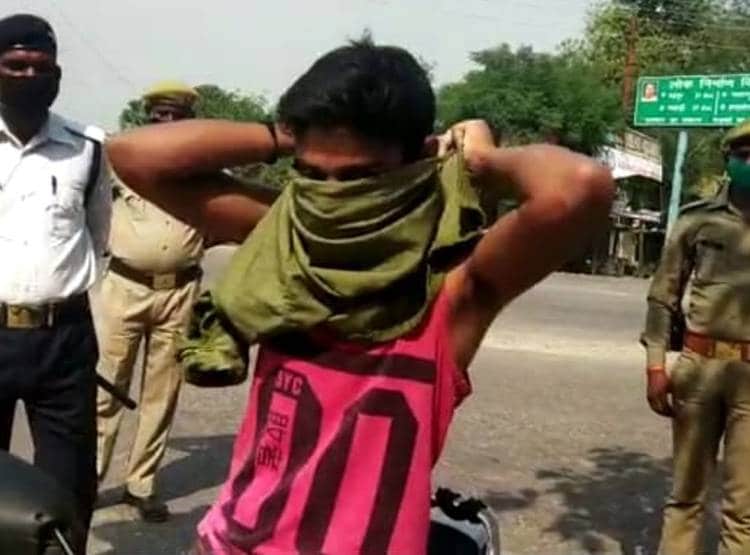 कोरोना का जैसे-जैसे भारत में कहर बढ़ता जा रहा है, पुलिस भी इससे बचाव के साधनों को लेकर सख्त होती जा रही है. यूपी में लॉकडाउन के दौराना ऐसा ही एक मामला देखने को आया जहां बिना मास्क पहने एक शख्स बाइक से कहीं जा रहा था तो पुलिस ने शर्ट खोलकर मुंह पर बांध लेने को कहा.