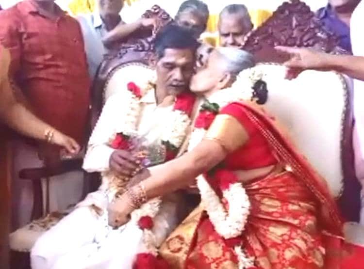 प्यार में हद से ज्यादा गुजरने के लिए किसी उम्र का बंधन नहीं होता, वह तो बस हो जाता है. इस बात को एक कपल ने साबित किया. देश में शनिवार को एक ऐसी शादी हुई जिसमें 67 साल का दूल्हा था और 65 साल की दुल्हन थी. इतना ही नहीं, स्टेज पर ही दुल्हन ने दूल्हे को किस भी किया. यह अनोखी शादी केरल के त्रिशूर में हुई.