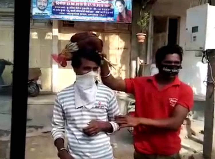 इनमें से एक युवक को कहा जा रहा है कि दूसरे के सिर पर मुर्गा रखो और जिसके सिर पर मुर्गा रखा गया, उसे कान पकड़कर उठक-बैठक लगाने का फरमान सुनाया जा रहा है.