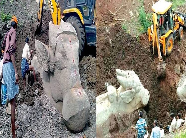 स्थानीय रिपोर्ट के मुताबिक नंदी की इस प्रतिमा को ढूंढने के लिए गांव वालों को तीन से चार दिनों तक लगातार खुदाई करनी पड़ी, जिसमें जेसीबी मशीन की भी मदद ली गई. अब नंदी बैल की इन मूर्तियों को बाहर निकाल लिया गया है. (तस्वीर - पुरातत्व विभाग, कर्नाटक)