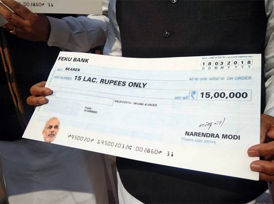 वास्तविक चेक की तरह इसे तैयार किया गया है. लेकिन इस पर विरोधियों ने फेंकू बैंक लिख दिया है और मोदी की फोटो भी लगा दी है. इस पर मोदी का असली सिग्नेचर भी चिपका दिया गया है.