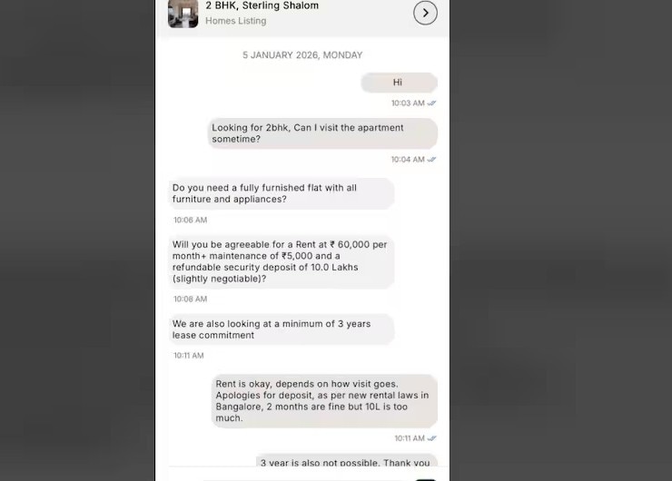 बातचीत की शुरुआत बेहद सामान्य थी. किराएदार ने लिखा-मुझे 2BHK चाहिए. क्या मैं अपार्टमेंट देखने आ सकता हूं? इसके जवाब में मकान मालिक ने पूछा कि क्या फ्लैट पूरी तरह फर्निश्ड चाहिए. इसके बाद उन्होंने अपनी शर्तें रख दीं-महीने का किराया 60 हजार रुपये, 5 हजार रुपये मेंटेनेंस और 10 लाख रुपये की रिफंडेबल सिक्योरिटी डिपॉजिट, जिसे उन्होंने थोड़ा नेगोशिएबल बताया. साथ ही यह भी साफ किया कि वे कम से कम तीन साल की लीज चाहते हैं.