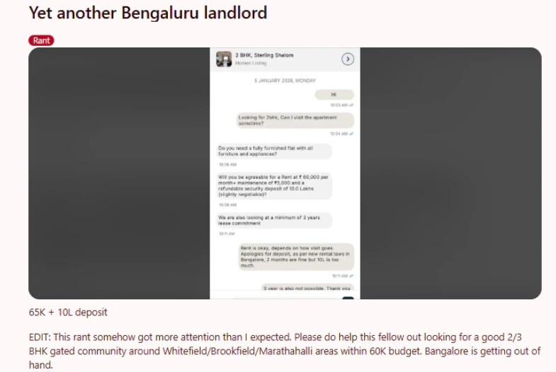 एक शख्स ने Reddit के r/Bengaluru फोरम पर अपने और एक मकान मालिक के बीच हुई बातचीत का स्क्रीनशॉट शेयर किया. पोस्ट का कैप्शन था-Yet another Bengaluru landlord. इस बातचीत में मकान मालिक ने 2BHK फ्लैट के लिए 10 लाख रुपये की सिक्योरिटी डिपॉजिट और कम से कम तीन साल की लीज की शर्त रखी.