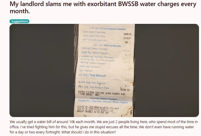 Reddit के r/Bangalore फोरम पर यूजर ने पोस्ट लिखकर बताया कि उनका मकान मालिक हर महीने भारी-भरकम पानी का बिल उन पर डाल देता है. पोस्ट के मुताबिक, हम सिर्फ दो लोग हैं, ज्यादातर समय ऑफिस में रहते हैं. कई बार तो हफ्ते में 1–2 दिन पानी की सप्लाई ही नहीं होती. इसके बावजूद हर महीने 10 हजार रुपये तक का बिल आ जाता है. हाल ही में 1.65 लाख लीटर पानी के इस्तेमाल का बिल आया, जिसमें कुल रकम 15,799 रुपये थी.