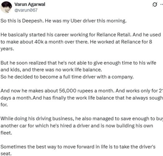 इसी सोच ने उनके जीवन में बड़ा मोड़ लाया. दीपेश ने साहसिक कदम उठाते हुए अपनी कॉर्पोरेट नौकरी छोड़ दी और ऊबर के लिए ड्राइविंग शुरू कर दी. शुरुआत में यह फैसला जोखिम भरा लगा, लेकिन जल्द ही उन्होंने साबित कर दिया कि सही प्राथमिकताएं जीवन की दिशा बदल सकती हैं. आज वह महीने में करीब 56,000 रुपये कमा रहे हैं और केवल 21 दिन काम करते हैं. अब उनके पास बाकी समय परिवार के साथ बिताने के लिए है, जो पहले संभव नहीं था.
