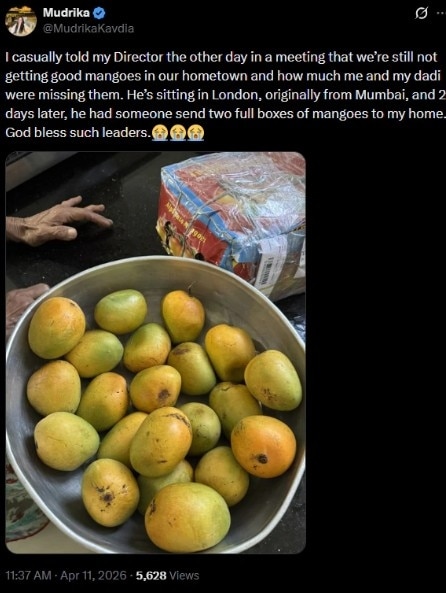 मुद्रिका के मुताबिक, उनके डायरेक्टर, जो मूल रूप से मुंबई के हैं लेकिन फिलहाल लंदन में रहते हैं, ने इस छोटी सी बात को दिल से लिया. सिर्फ दो दिन बाद उन्होंने किसी के जरिए उनके घर पर आम के दो बड़े बॉक्स भिजवा दिए.उन्होंने अपने पोस्ट में आम से भरा एक बड़ा बाउल और पैकिंग की तस्वीर भी शेयर की, जिससे यह भाव और भी खास और सच्चा लगा. अपनी खुशी जताते हुए उन्होंने लिखा-ऐसे बॉस को सलामत रहें.