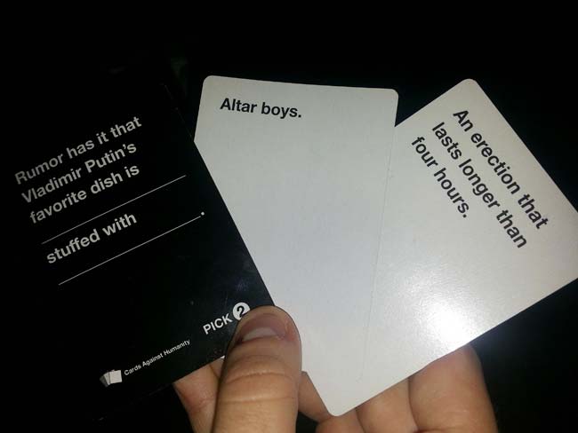 'Cards Against Humanity' एक कंपनी है जो पार्टी गेम्स बेचती है. गेम में काले और सफेद रंग के कार्ड होते हैं. एक शख्स काले कार्ड से 'फिल इन ब्लैंक्स' का सवाल पूछता है. बाकी सब लोग अपनी सफेद कार्ड से इसका जवाब देते हैं. फिर जो पूरा वाक्य तैयार होता है, वही इस गेम को मजेदार बनाता है.
