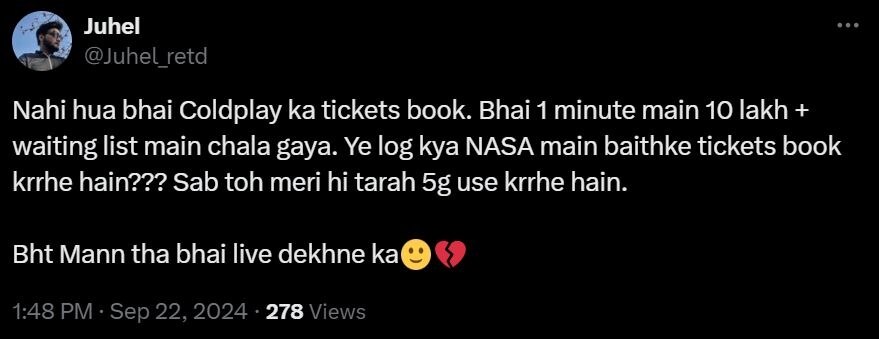 टिकट ना मिलने पर एक यूजर ने दुखी मन से लिखा-नहीं हुआ भाई कोल्डप्ले का टिकट. 1 मिनट में 10 लाख+ वेटिंग लिस्ट में चला गया. ये लोग क्या NASA में बैठकर टिकट बुक कर रहे हैं? सब मेरी तरह 5G ही तो यूज़ कर रहे हैं. बहुत मन था लाइव देखने का.