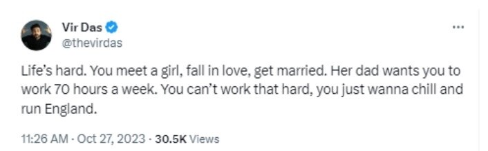 वीर दास ने लिखा- 'जिंदगी कितनी मुश्किल है, आप एक लड़की से मिलते हैं, आपको प्यार होता है, शादी होती है और लड़की के पिता चाहते हैं कि आप सप्ताह में 70 घंटे काम करें. आप इतनी मेहनत कर नहीं सकते और मजे करना चाहते हैं तो आप इंग्लैंड चलाते हैं.'