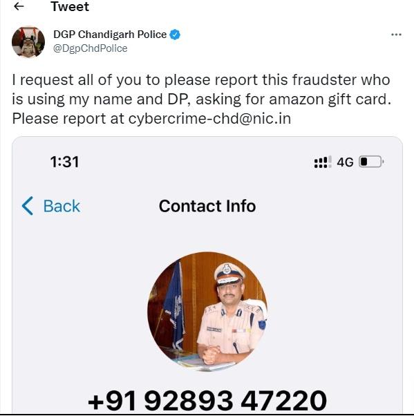 DGP ने एक स्क्रीनशॉट करते हुए अपने ट्वीट में लिखा- 'मैं आप सभी से अनुरोध करता हूं कि कृपया इस धोखेबाज की रिपोर्ट करें जो मेरे नाम और डीपी का उपयोग कर रहा है. Amazon गिफ्ट कार्ड मांग रहा है.' उन्होंने Cyber Crime टीम की वेबसाइट भी शेयर की है. यह जानकारी देने के साथ चंडीगढ़ DGP ने ट्विटर पर शातिरों द्वारा बनाए गए फर्जी वाट्सएप नंबर को भी शेयर किया है.